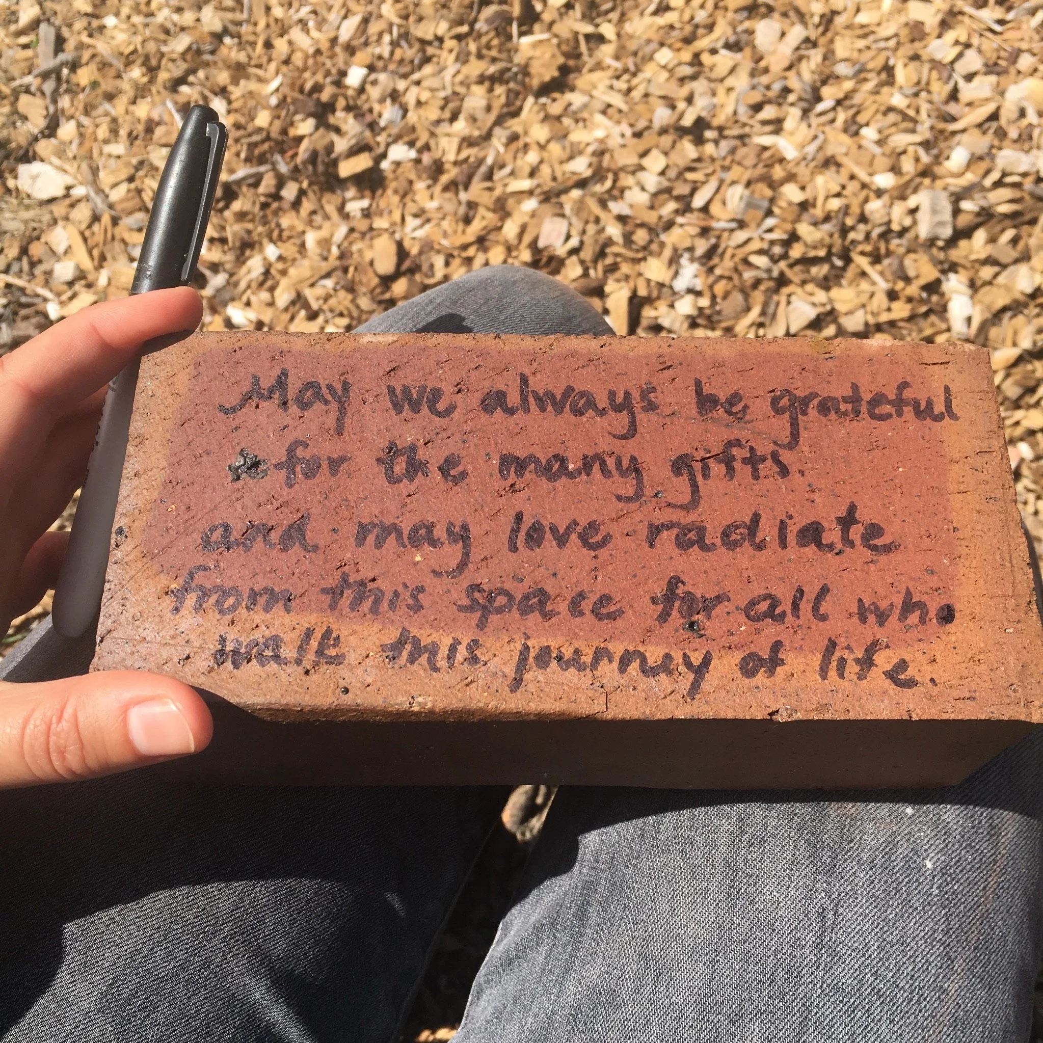 The children took the shredded Sunday bulletins from the Church and made them into paper hearts, writing their own prayers and blessings for the world. The parishioners and school families also wrote their own prayers which were then blessed by Reverend Fisher and then scattered on the earth by the children before the top level of the labyrinth was installed. When the pallets of bricks arrived, the children carried each brick to be laid along the path.